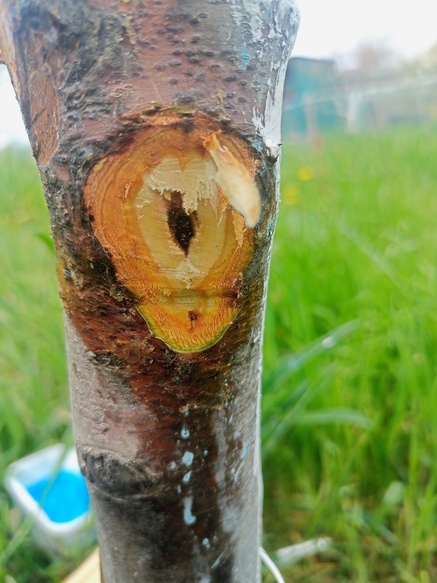 На груше еще похожая рана вверху основной ветки была, ветку убрали. Но на этой же груше и на других деревьях точно так же сантиметров 10 от земли одинаковые раны. На нескольких под варом они мокли, как черная плесень грибки были. Это фото до чисток. Я вычистила сколько могла, но оно идет внутрь ствола, здоровые ткани с коричневыми слоями. Продезенфицировала купоросом, замазала живицей. побелка.