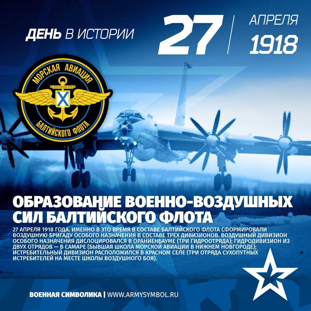 27 апреля 1918 года. Именно в это время в составе Балтийского флота сформировали Воздушную бригаду особого назначения в составе трех дивизионов. Воздушный дивизион особого назначения дислоцировался в Ораниенбауме (три гидроотряда); гидродивизион из двух отрядов — в Самаре (бывшая школа морской авиации в Нижнем Новгороде); истребительный дивизион расположился в Красном селе (три отряда сухопутных истребителей на месте школы воздушного боя). #Флот #Авиация #ВВС #БФ #БалтийскийФлот #ДКБФ #МорскаяАвиация #календарь #символика