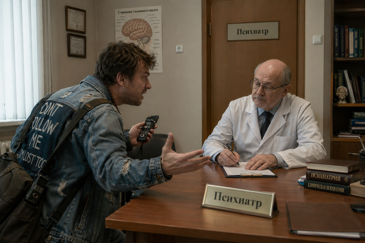 Вошёл молодой человек с диктофоном в одной руке и рюкзаком в другой. Бросил ухмыляющийся взгляд на табличку «Психиатр», на доктора, на кабинет.