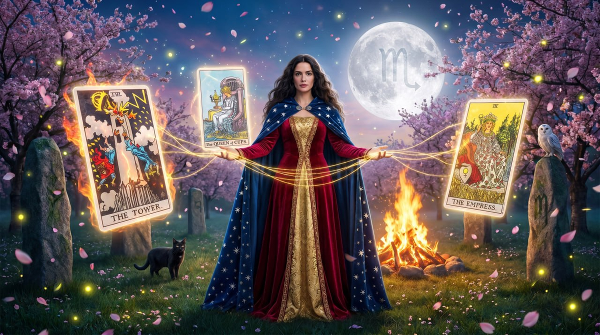 Дорогие мои! ✨ Впереди семь дней, которые станут настоящим коктейлем из мощных космических энергий. 30 апреля нас ждёт Белтейн, древний кельтский праздник огня, плодородия и пробуждения жизненной силы. 1 мая в небе разгорается Полнолуние, освещая всё, что было скрыто. И всё это великолепие происходит на фоне нарастающего метеорного потока Эта-Аквариды, осколков легендарной кометы Галлея, которые прочерчивают небо звёздными следами желаний. Такое сочетание открывает редкий портал, через который Вселенная щедро отвечает на запросы души. А что же говорят Таро? На стол легли три Аркана: Старший Аркан Башня в начале недели и на растущей Луне, Королева Кубков и Императрица. 🗼 БАШНЯ открывает неделю мощным энергетическим разрядом. Этот аркан приходит, когда Вселенная решает обнулить устаревшие конструкции, которые мы сами уже не в силах разобрать. Башня работает как небесная молния, она бьёт точно в ту структуру, которая держала вас в иллюзии стабильности. И это не случайно перед Белтейном,
