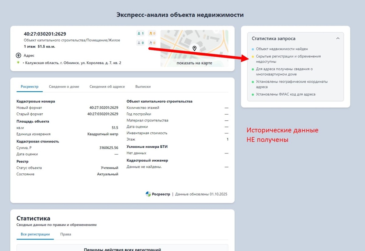 Друзья, всем привет! 👋 Сегодня делимся кейсом, который доказывает: ваша обратная связь — наш главный двигатель роста. Один внимательный пользователь заметил, что скоринг по его квартире показал не всю историю регистраций. Огромное ему за это спасибо! 🙏 Это помогло нам подготовить полезную инструкцию для всех. Давайте по порядку. 🤔 Что такое скоринг объекта? Это предварительный срез данных. Его главная задача — быстро собрать ключевую информацию и дать вам общую картину для первого анализа. Представьте, что это аннотация к книге: помогает понять сюжет, но не заменяет саму книгу. ⚙️ Почему история может быть неполной? Мы собираем данные из официальных госисточников. Иногда, по техническим причинам, некоторые записи могут быть недоступны для автоматической выгрузки. Но мы за прозрачность! Именно поэтому в интерфейсе всегда виден статус получения исторических данных. Он честно показывает, насколько полный срез удалось получить в этот раз. 🎯 ИНСТРУКЦИЯ: Как получить 100% объект