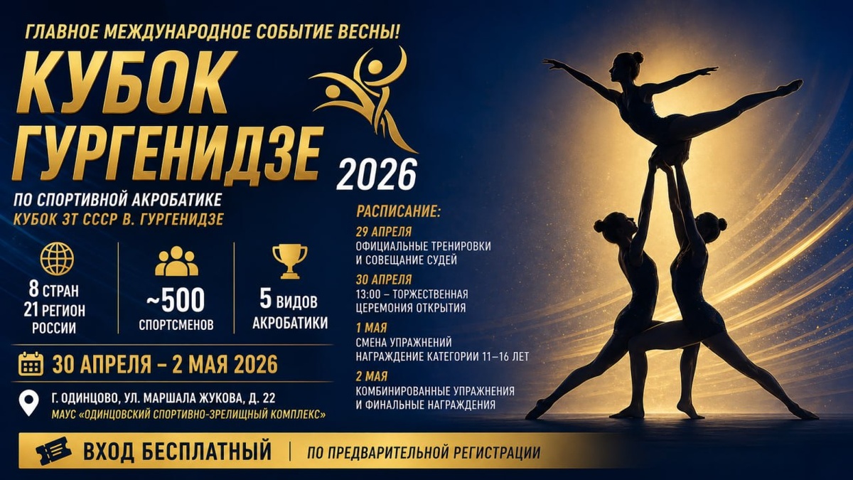 ! 🌍✨ Акросемья, приготовьтесь к самому масштабному турниру российского сезона! С 30 апреля по 2 мая 2026 года подмосковное Одинцово станет мировой столицей акробатики — нас ждет традиционный «Кубок ЗТ СССР В. Гургенидзе» В турнире примут участие порядка 500 спортсменов из 8 стран и 21 региона России На ковер выйдут настоящие топы, включая победителей Кубка мира 2026 года в Португалии — сильнейшую мужскую четверку из Воронежа Николай Крестников, Степан Кульбакин, Сергей Кондрачук, Артем Кузнецов и серебряных призеров КМ Ивана Дерендяева и Матвея Черных 29 апреля: Официальные тренировки и совещание судей 30 апреля (13:00): Торжественная ЦЕРЕМОНИЯ ОТКРЫТИЯ В этот день смотрим баланс (женские/мужские пары и четверки) и темп (смешанные пары и тройки) 1 мая: Смена упражнений: темп для пар и четверок, баланс для смешанных пар и троек Награждение категории 11–16 лет 2 мая: Комбинированные упражнения и финальные церемонии награждения для всех старших категорий 📍 Где: г. Одинцово, ул.