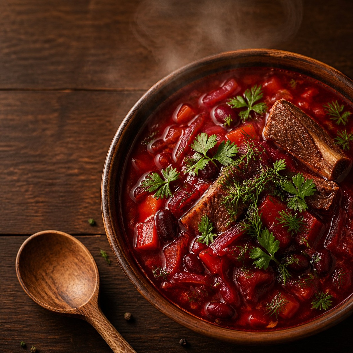 Этот борщ — не мем. Он реально существует, и он реально полезный. Говядина на кости даёт бульон с коллагеном и глицином. Фасоль — долгую сытость и чистый кишечник. Сладкий перец — витамин С, который помогает железу усвоиться, а не пройти транзитом. Сметаны нет, потому что она здесь лишняя: бульон и так самодостаточен.