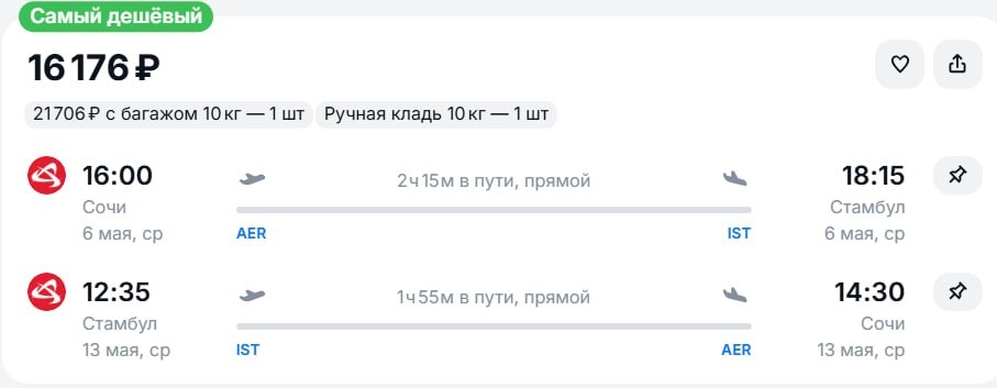из Москвы за 20900руб. 14 мая - 19 мая https://trvl.click/x/F8X3K из Санкт-Петербурга за 25300руб. 20 мая - 27 мая https://trvl.click/x/OZnfa из Казани за 23700руб. 20 мая - 27 мая https://trvl.click/x/AF2UO из Сочи за 16200руб. 6 мая - 13 мая https://trvl.click/x/80auk из МинВод за 17300руб. 12 мая - 19 мая https://trvl.click/x/QHBGp
