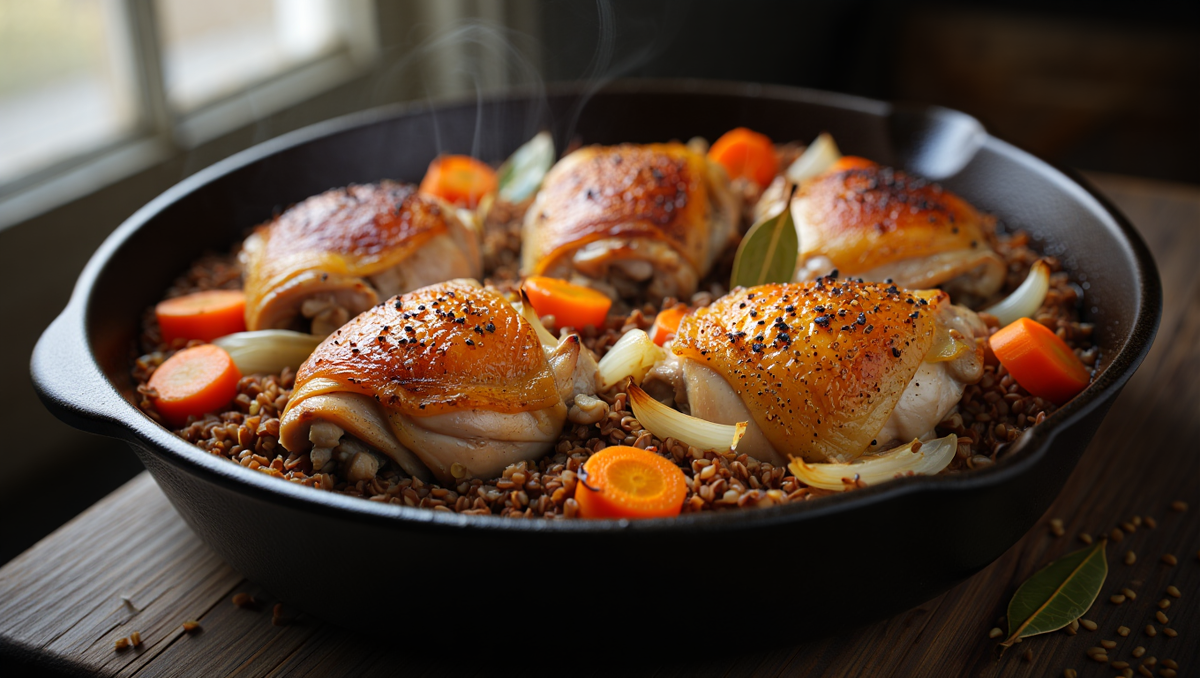 Куриные бёдра не варю и не жарю. Запекаю в одном противне с гречкой. Гречка впитывает сок, мясо отдаёт жир, и получается основа на три ужина. Чек на всё примерно 312 рублей, проверяла на прошлой неделе, брала в "Чижике", не реклама, просто дешевле вышло, я удивилась и побежала к вам, делиться радостью, девочки. Пять лет искала способ кормить семью из четырёх человек дёшево, но без ощущения, что мы экономим. Этот вариант работает. Гречка под курицей готовится в собственном бульоне, а не в воде. Жир с бёдер стекает вниз, крупа берёт его на себя, и вкус получается насыщенный, как у плова, только без масла и заморочек. На второй день эту основу превращаю в суп, на третий, в начинку для лепёшек. Один противень, три разных ужина. — Куриные бёдра — 1 кг (около 220 рублей вышло, беру охлаждённые, не замороженные, в замороженных воды больше) — Гречка — 400 г (40 рублей, ядрица, не продел) — Лук — 2 шт. (10-30 рублей) — Морковь — 2 шт. (15 рублей) — Чеснок — 4 зубчика (5 рублей) — Растительное м