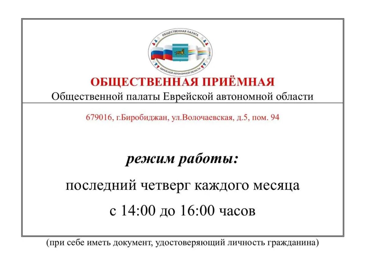 ! 📍 Адрес: г. Биробиджан, ул. Волочаевская, д. 5, первый этаж, помещение № 94. 📆 Дата: 30 апреля 2026 года. ⏰ Время работы: с 14:00 до 16:00. Здесь вы сможете получить консультацию и обратиться с интересующими вас вопросами.