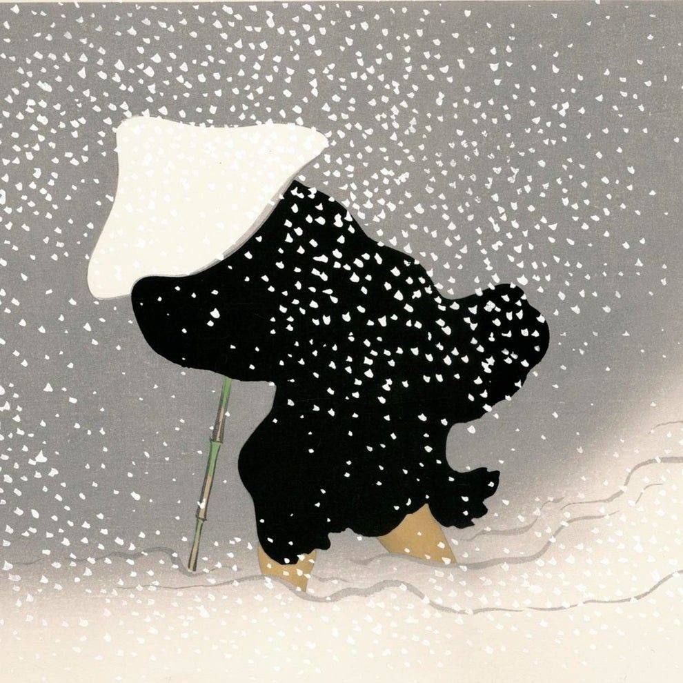 Но апрельский снегопад вводит в смятение... Очень сочувствуем этому путнику, идущему в непогоду, но у нас и самих дела не сильно лучше… Гравюра «Вихревой снег» 1909 года японского художника и дизайнера Камисаки Секка (1866–1942) Фото: московская сакура и апрельский снегопад.
