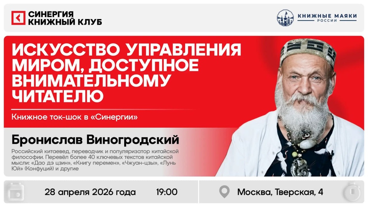 » Дорогие книгочеи! В преддверии завтрашнего общения с Брониславом Виногродским хотим поделиться с вами фрагментом со встречи, прошедшей в декабре 2025 года. Известный китаевед и переводчик древних текстов был гостем Книжного клуба «Синергии». И в ходе той самой встречи записали видео с его размышлениями о природе времени. В нём он разрушает главный миф цифровой эпохи. Мы привыкли жаловаться на нескончаемый поток уведомлений и нехватку минут на книги. Но парадокс: на правильные вещи время есть всегда. 👉 Смотрите полное видео И ждём вас завтра (очно и онлайн). Обладатели VIP-билетов получат книгу с автографом, приоритетную рассадку в первых рядах и фото со спикером. 📅 28 апреля, вторник ⏰ Сбор гостей — 18:30, начало события — 19:00 📍 Москва, Тверская, 4 Количество мест ограничено. Билеты и онлайн-трансляция