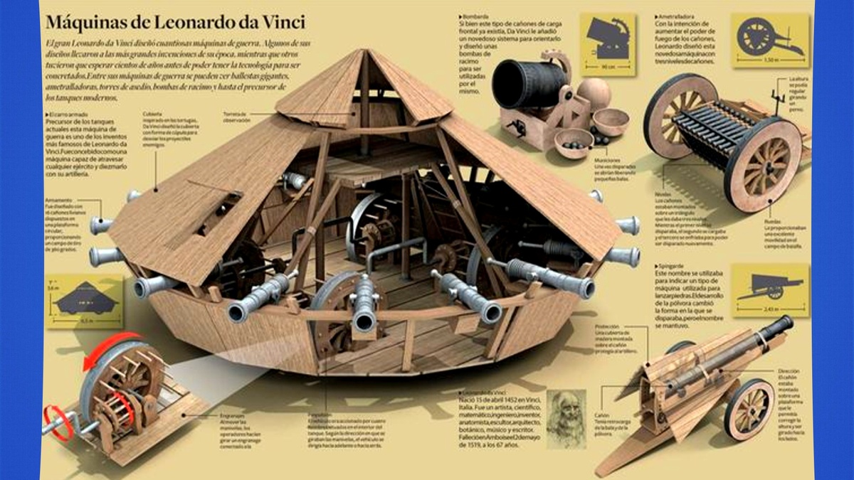 В Средневековье тяжёлые рыцарские повозки, защищённые деревянными щитами, пытались пробить строй пехоты, а в 1487 году Леонардо да Винчи представил свой эскиз, но в нём была одна загвоздка: шестерни в механизме были соединены так, что колёса вращались в противоположные стороны, и конструкция никуда не могла тронуться. Одни историки считают это ошибкой, другие — гениальным самосаботажем: инженер, служивший миланскому герцогу, сознательно заложил в чертежи «защиту от дурака», чтобы его детище не использовали во зло.