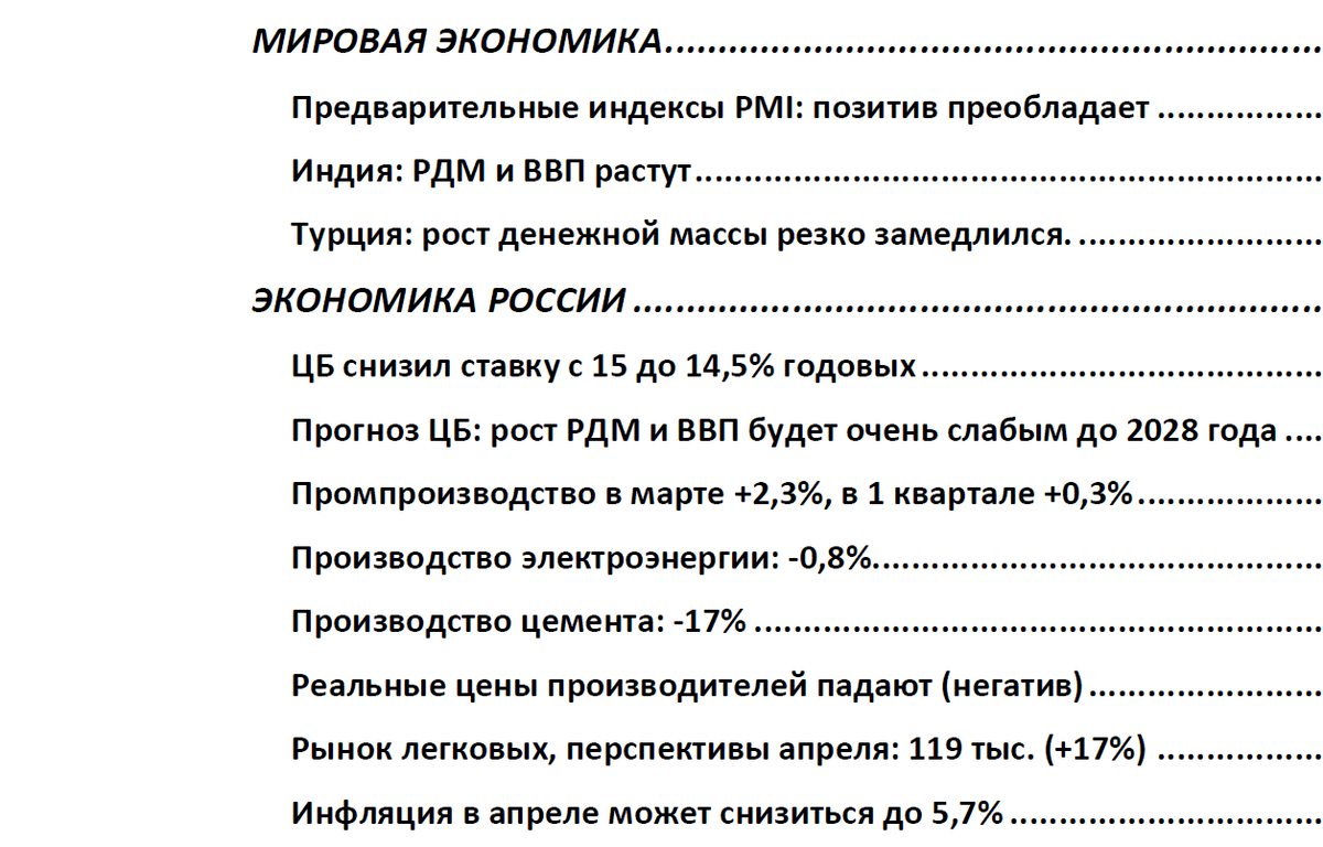 29 апреля мы узнаем оценку выпуска базовых отраслей (ВБО) и оценку МЭР по ВВП за 1 квартал. Напишем об этом в следующем обзоре.