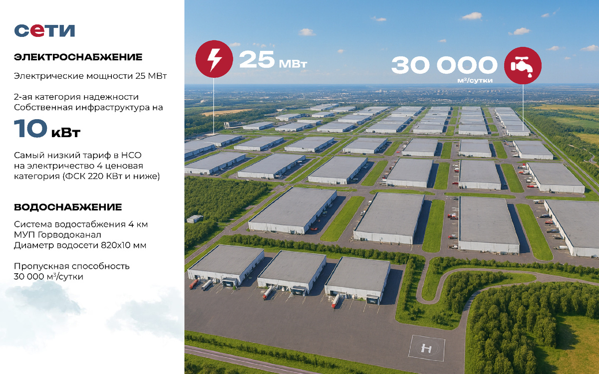 Площадка в 360 га находится рядом с аэропортом Толмачёво, трассой «Иртыш», ж/д станцией Клещиха. В парке сформировано 60 земельных участков площадью по 5 гектаров, подведены коммуникации и подготовлена инфраструктура. Площадка ориентирована на производственные и логистические компании — доступны форматы размещения от компактных производственных модулей до крупных складских комплексов. Также предусмотрена возможность реализации совместных проектов с управляющей компанией по схеме строительства под аренду. Коротко о проекте: