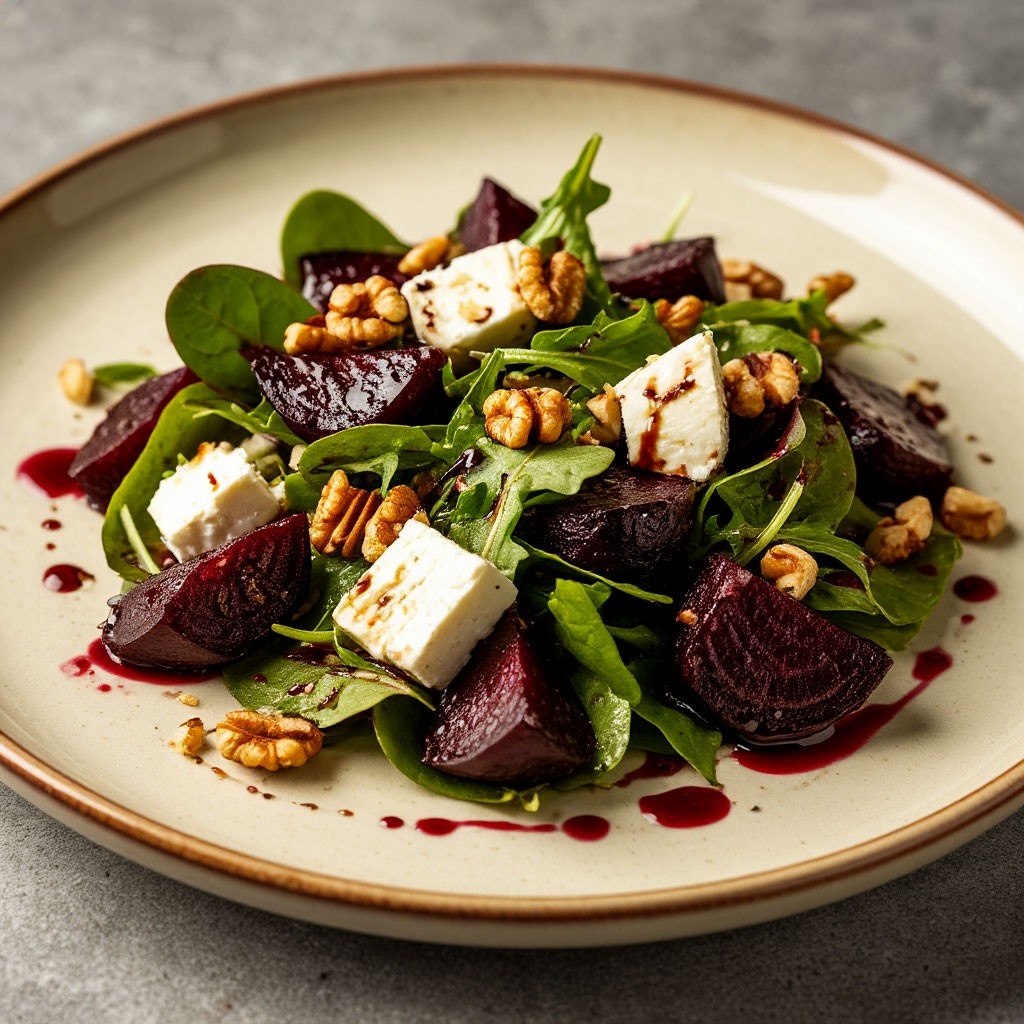 Элегантный, но простой салат с насыщенным вкусом. Свёкла запекается заранее (можно использовать готовую), остальное готовится за 15 минут.