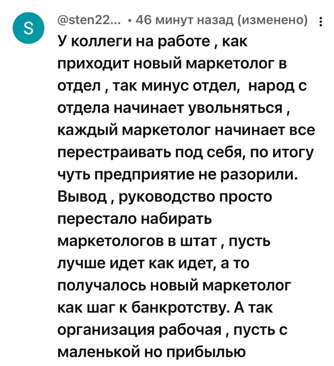 Всегда считал, что маркетологи, как и SEO- специалисты - шарлатаны :) Вот мне пишут, сложно не согласиться. Каждый новый маркетолог - шаг к банкротству :)