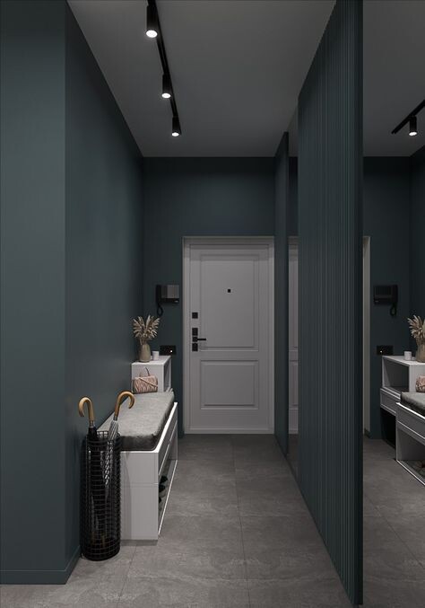 Прихожая часто становится «слепой зоной» ремонта: сюда бросают остатки материалов, а стены красят в максимально нейтральный бежевый, боясь сделать пространство темнее. Но посмотрите на этот интерьер! Дизайнер смело использовал глубокий сине-зеленый (или темно-серый с синим подтоном) цвет для стен, и результат потрясающий. Коридор не стал мрачным — он стал камерным, дорогим и невероятно стильным. Давайте разберем ключевые приемы этого дизайна и узнаем, как создать подобную атмосферу у себя дома. Главный стереотип гласит: «В маленькой комнате нужны только светлые стены». Этот проект доказывает обратное. В узком коридоре с темными стенами свет играет решающую роль. Обычной люстры здесь было бы недостаточно. Справа мы видим огромное зеркало (или зеркальную панель), которое занимает почти всю стену. Мебели здесь немного, но она работает на 100%. Эта прихожая — пример того, что смелость в дизайне окупается. Темные стены не съели пространство, а придали ему характер и глубину. Это интерьер, к