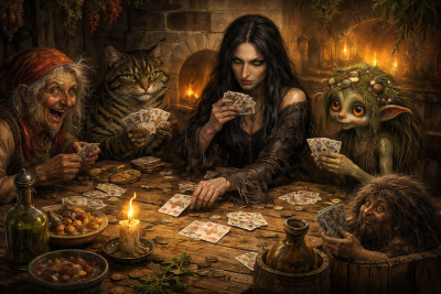 Кикимора отчаянно пыталась мухлевать — прятала карту в рукав платья из рыболовной сети. Но Камыш, зараза, палил её безбожно.