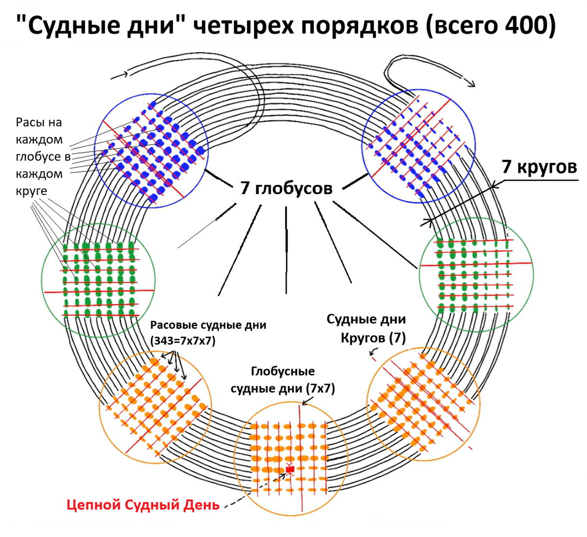 Сама идея о том, что «Судный день» для цепи – это процесс, растягивающийся на значительный период, подтверждается утверждением: «В седьмом круге Лунной Цепи с каждого глобуса те обитатели, для которых условия последующих глобусов были неподходящими, выбывали, оставаясь в состоянии покоя до тех пор, пока следующая цепь не была готова к возобновлению их эволюции». Это кажется мне очень логичным, и также подтверждает теорию о существовании ряда событий 2-го, 3-го и 4-го порядка, которые приостанавливают эволюцию некоторых монад на определенный период.