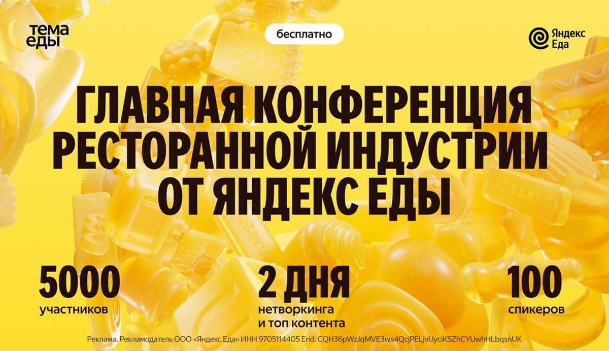 лекций. В этом году конференция пройдет 20-21 мая - и, судя по программе, она будет максимально насыщенной. Яндекс Еда вместе с экспертами подготовила для нас 100+ лекций и кейсов по 7 площадкам: • Главная сцена. Хочу посетить ее. Здесь будут живые интервью предпринимателя, сооснователя маркетплейса услуг YouDo, медиа и бизнес-сообщества «Основатели» Дениса Кутергина с ведущими рестораторами, среди которых Дмитрий Блинов, Арам Мнацаканов и другие. • Управление • Доставка • Маркетинг • Кухня • СКОЛКОВО для бизнеса • Люди и технологии За пару дней можно будет и насмотренность прокачать, и полезные контакты найти, и просто понять, как сегодня устроен ресторанный бизнес изнутри. А еще - послушать классных спикеров, среди которых: Михаил Левченко, Дмитрий Журкин, Артем Гребенщиков, Алексей Гребенщиков, Кирилл Белюсев, Марсель Шарипов, Александр Умаров и Сергей Глазунов. 🏠 Хлебозавод №9 📞Бесплатная регистрация здесь