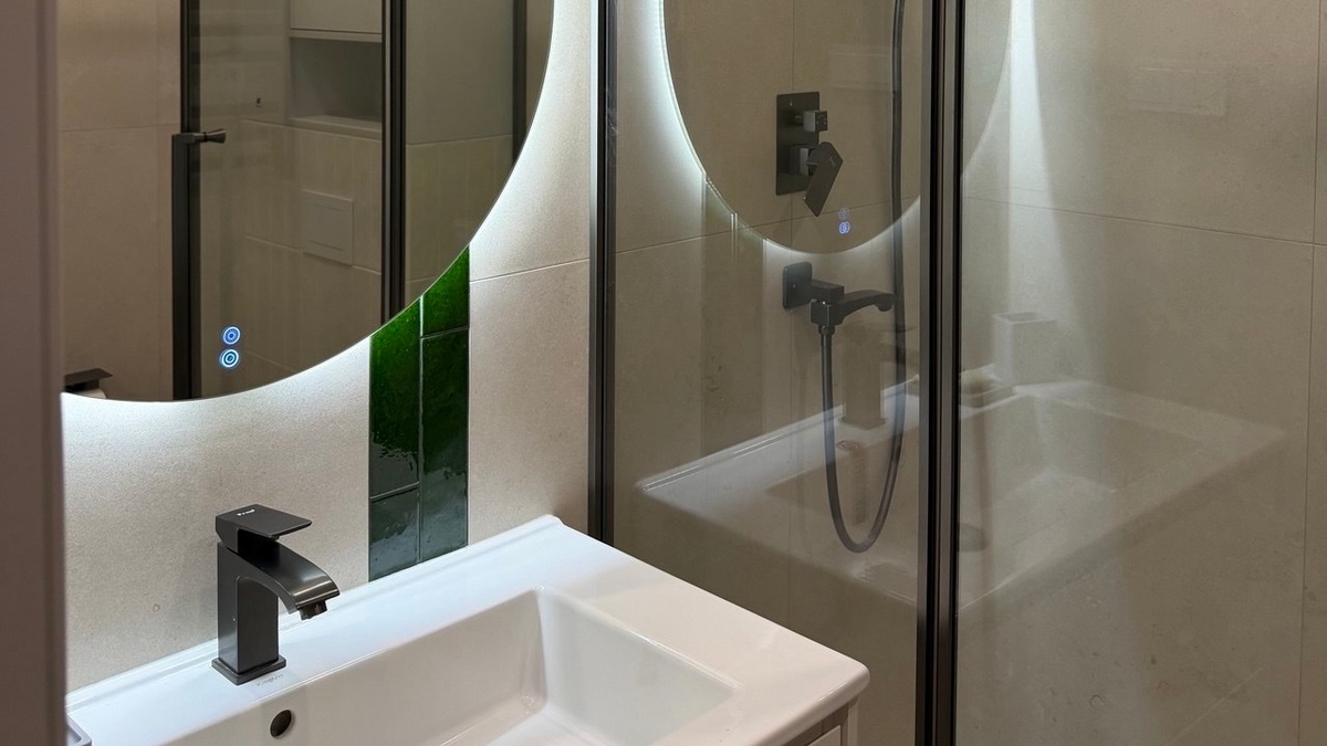 Травертин — природный камень с богатой историей и узнаваемой текстурой. Его имитация в керамогранитной плитке позволяет привнести в интерьер ванной комнаты благородную эстетику натурального материала, не переплачивая за оригинал и не сталкиваясь с его эксплуатационными ограничениями. Разберёмся, как стильно и практично оформить душевую комнату с плиткой под травертин. Давайте разберем на реальном примере, как использовать плитку под травертин в современных ванных комнатах. Стены облицованы крупноформатной плиткой светлого оттенка с лёгкой текстурой травертина. Это создаёт ощущение чистоты и визуально расширяет пространство. Идеи дизайн-проектов для ванной. Особого внимания заслуживает декоративная вставка между душевой кабиной и раковиной: вертикальная полоса из глянцевой тёмно-зелёной плитки. Этот акцент: Интерьер выглядит стильно, современно и очень функционально. Сочетание крупной плитки и минималистичной мебели создаёт ощущение порядка и чистоты. Акцентная вставка из зелёной плитк