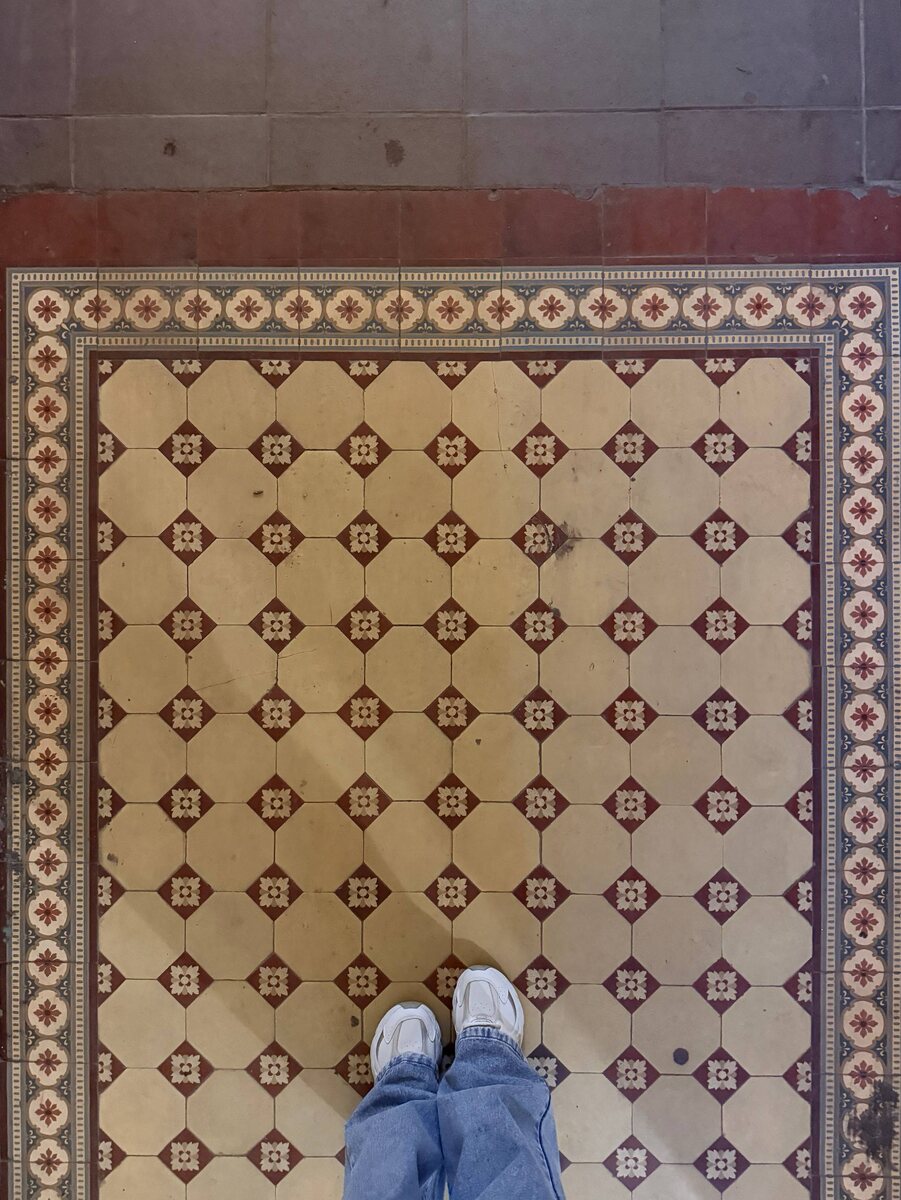 😌 Это доходный дом купца Гвоздева, где сохранился невероятно красивый метлахский ковер❤️ Дом 1903 года постройки. На полу — плитка фабрики Villeroy & Boch. В то время это была самая популярная фабрика, которая впоследствии, не справившись со спросом, продала технологию производства другим производителям. Тогда на плитку давали гарантию в 100 лет! И ведь не прогадали — свыше 120 лет она лежит без сколов и повреждений. Только очень просится хороший клининг 🫧🧽, и у плитки начнётся новая жизнь🙌🏻
