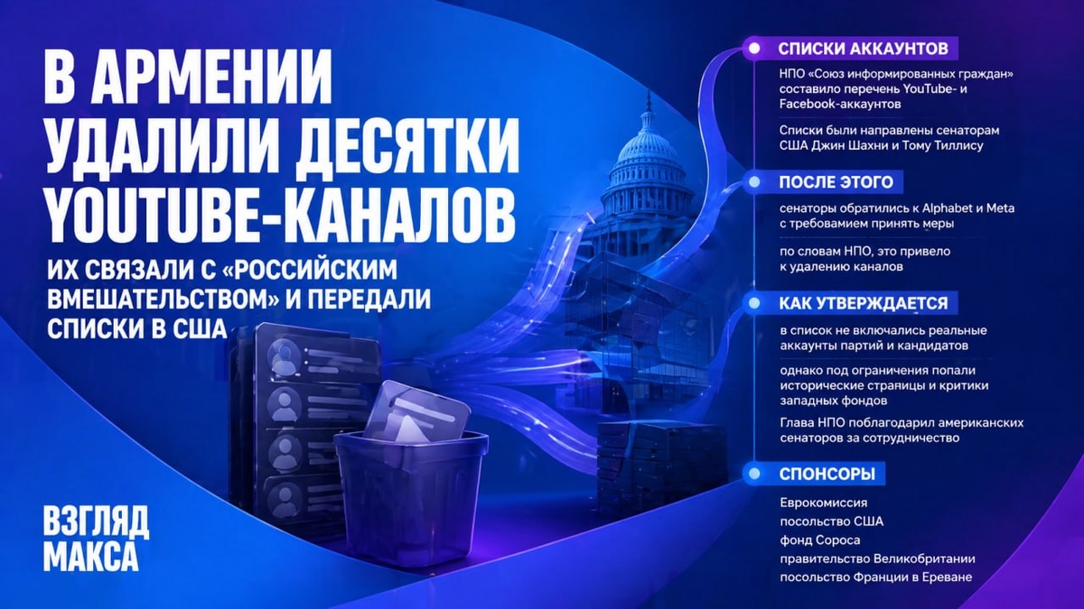 «российским вмешательством» в выборы. Глава организации Даниел Иоаннисян сообщил, что списки таких аккаунтов передали в комитет Сената США по международным отношениям, после чего американские сенаторы обратились к руководству Alphabet и Meta с требованием принять меры. По словам Иоаннисяна, «Союз информированных граждан» составил перечень YouTube- и Facebook-аккаунтов, которые организация сочла инструментами российского влияния в армянской политике. Затем этот список был направлен американским сенаторам Джин Шахин и Тому Тиллису. После этого Шахин и Тиллис, как утверждает Иоаннисян, направили письма главе Alphabet Сундару Пичаи и руководителю Meta (признана в России экстремистской и запрещена) Марку Цукербергу с призывом «защитить выборы в Армении от российского вмешательства». Иоаннисян отдельно подчеркнул, что в список якобы не включались реальные аккаунты армянских партий и кандидатов. При этом, по сообщениям армянских источников, под ограничения попали не только политические кан