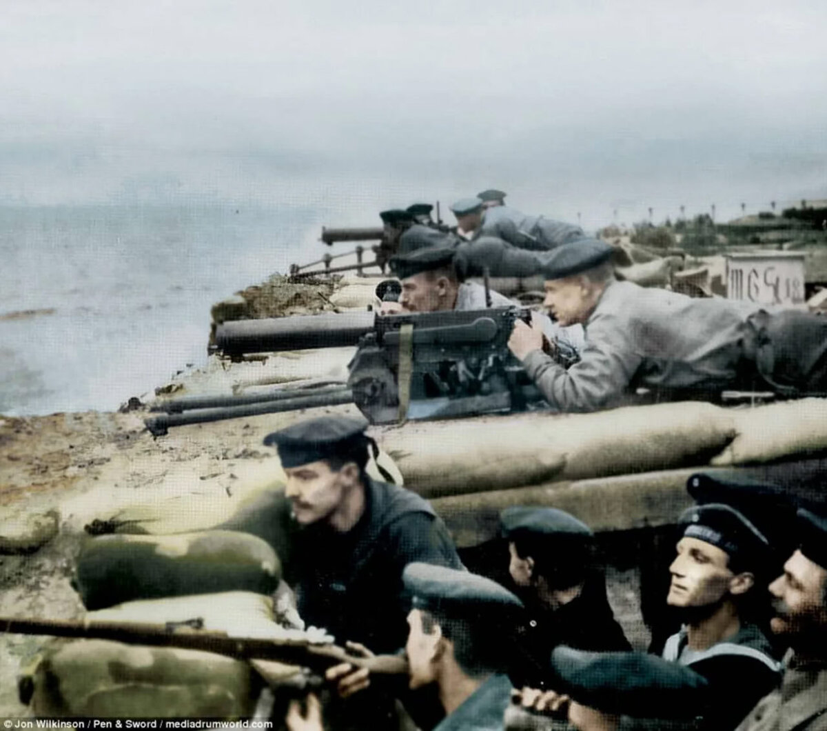 Солдаты немецкого военно-морского корпуса занимают пулеметные позиции на бельгийском побережье, 1918 год