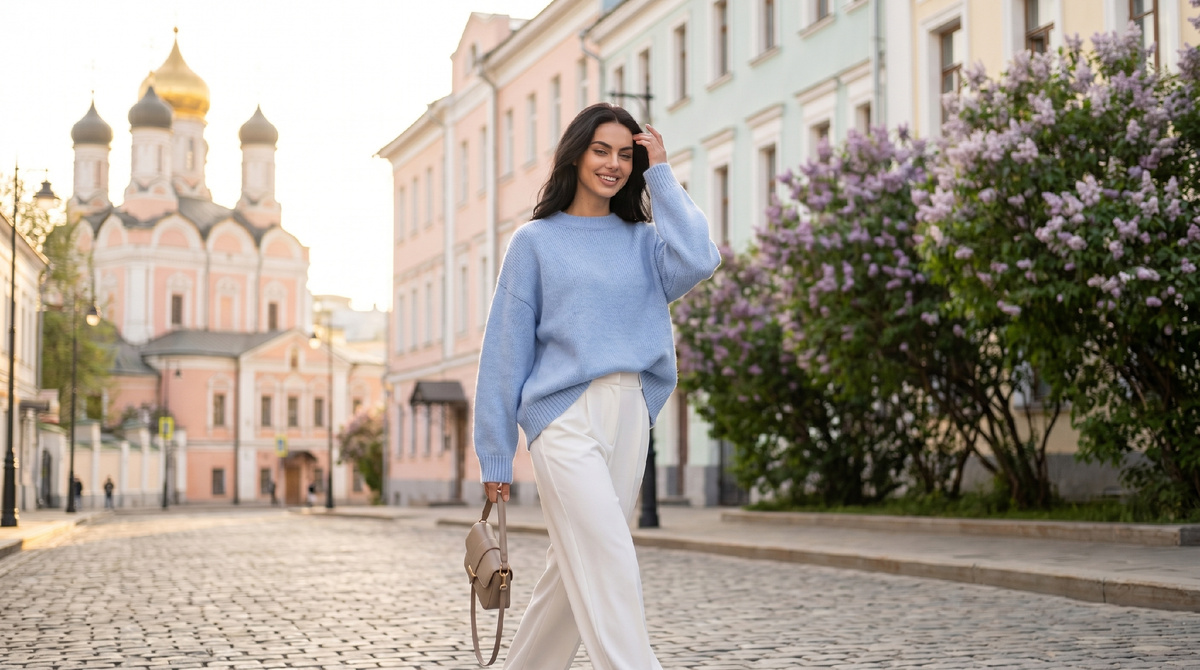 Белые брюки — это вызов. Красиво они смотрятся только при правильном сочетании. Я помню, как в начале апреля в Новосибирске попыталась надеть их с ярким жакетом, но образ выглядел тяжеловато. А вот спустя пару недель, добавив легкий голубой свитерок и уместные аксессуары, получила много комплиментов.