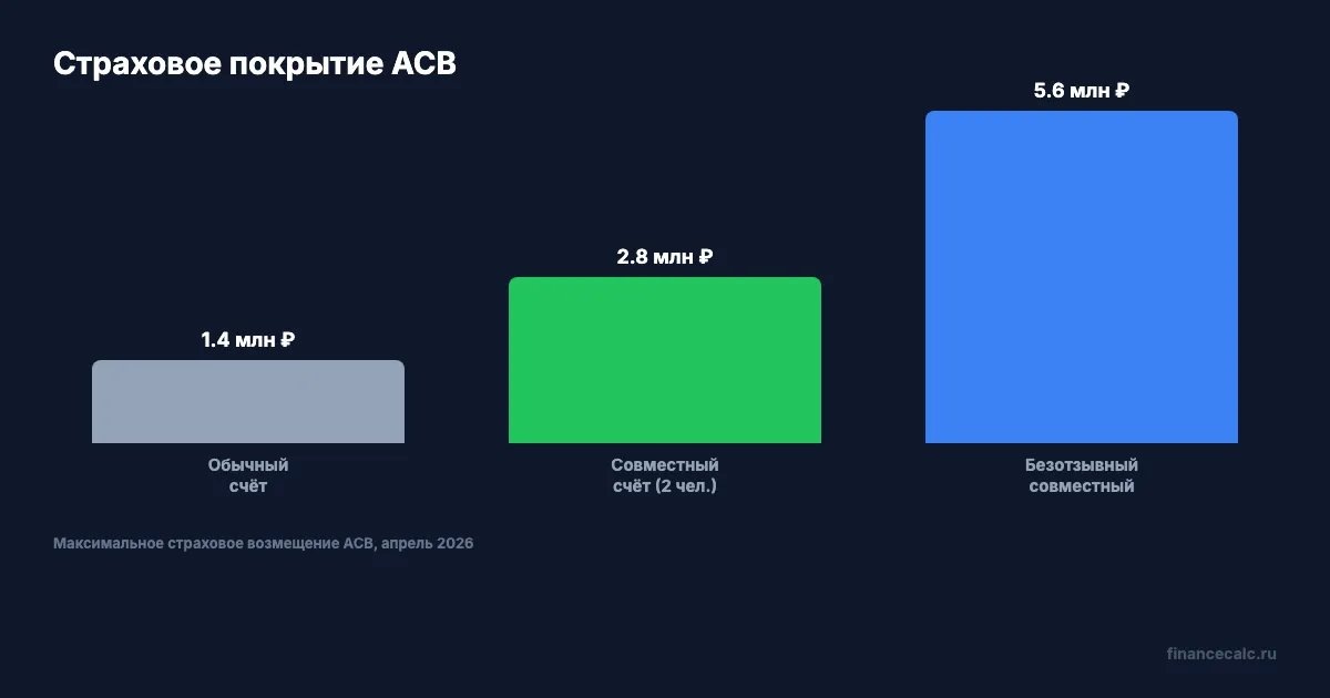 Первый и главный — удвоенное страхование. АСВ страхует каждого совладельца отдельно: 1,4 млн рублей на человека. Два совладельца — страховое покрытие до 2,8 млн рублей в одном банке. Если дополнительно оформить на совладельцев безотзывные сберегательные сертификаты от 3 лет (ФЗ № 347-ФЗ от 31.07.2025), по ним действует отдельный лимит до 2,8 млн на каждого — суммарно с обычным счётом до 4,2 млн на совладельца.