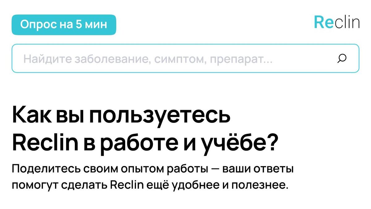 ❓ Мы хотим сделать Reclin ещё удобнее и полезнее - не абстрактно, а под реальные задачи врачей, ординаторов и студентов 🤩🤩 Нам важно понять: - в каких ситуациях вы открываете сайт; - что чаще всего ищете; - какие разделы используете; Опрос займёт 5 минут. В конце можно оставить контакты для короткого интервью. За участие в интервью подарим 1 месяц доступа к Reclin 💻 Ваши ответы помогут нам понять, каким должен быть Reclin как настоящий практический инструмент для врача и студента 💗 👉 Пройти опрос: https://forms.gle/bUsWzWRBbRsZFgWS8
