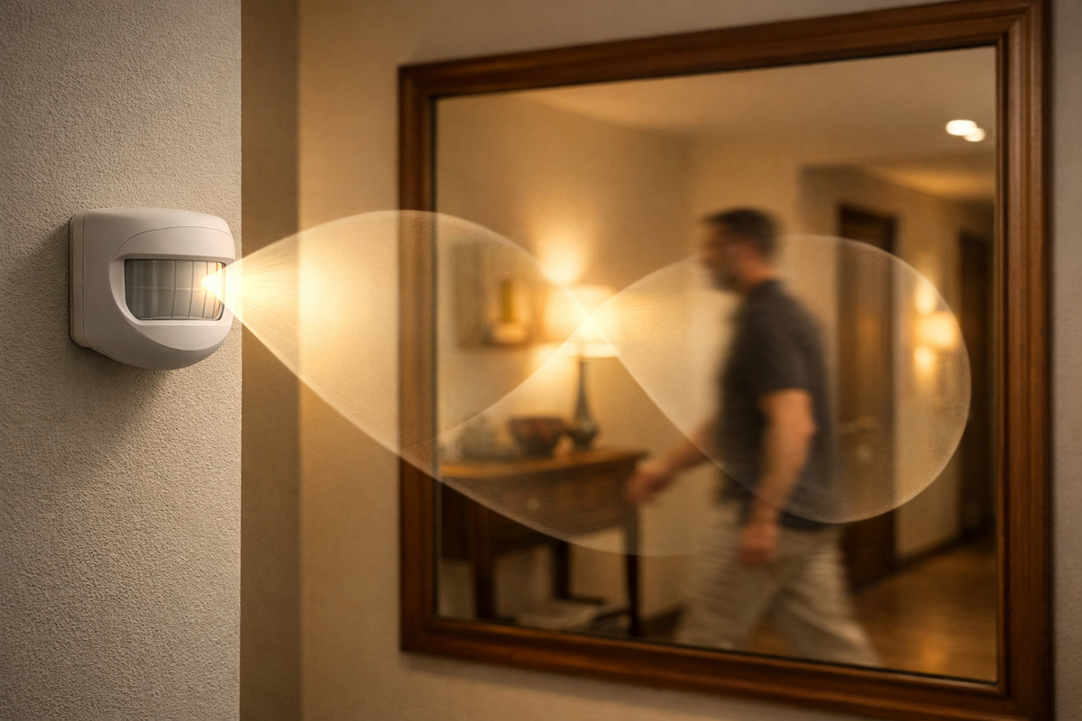 Зеркала и стекло часто ломают работу датчиков, хотя визуально кажется, что всё размещено правильно. Датчик «видит» движение там, где его нет, или наоборот пропускает человека. Причина в отражениях и особенностях работы сенсоров. Если это не учесть на этапе установки, появляются ложные срабатывания и нестабильная логика света. 1. Зеркало удваивает зону обнаружения и даёт ложные срабатывания