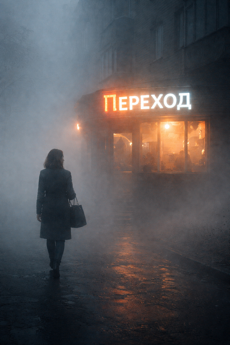 Впрочем, что ей туман? Ноги привычно понесли известным, хоженным маршрутом - пара подъездов вниз, нырок под арку, дальше на хорошо уложенный тротуар из брусчатки и по очертаниям тополей до заветного кафе. Но тут ждал сюрприз - хозяева наконец-то сменили вывеску и из белёсой мглы гордо переливалось буквами название "Переход".