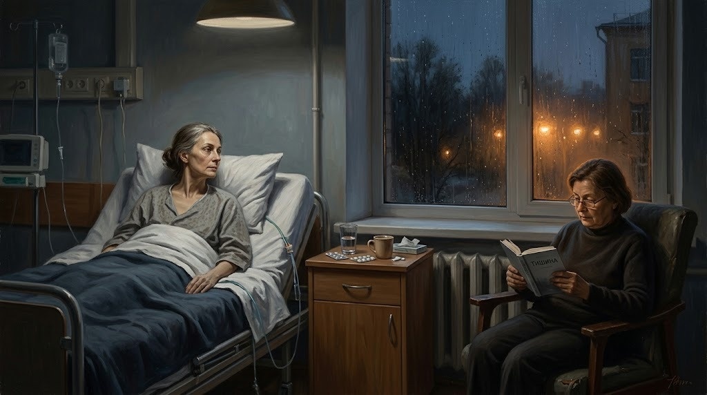 Лена просидела рядом молча ещё долго – Рита не смотрела на часы, но свет за окном успел смениться: серое утро стало серым днём, тень от подоконника переползла через всю кровать. Соседняя койка так и оставалась пустой. В коридоре иногда проходили люди – голоса, каблуки, звяканье чего-то металлического. В палате было тихо.