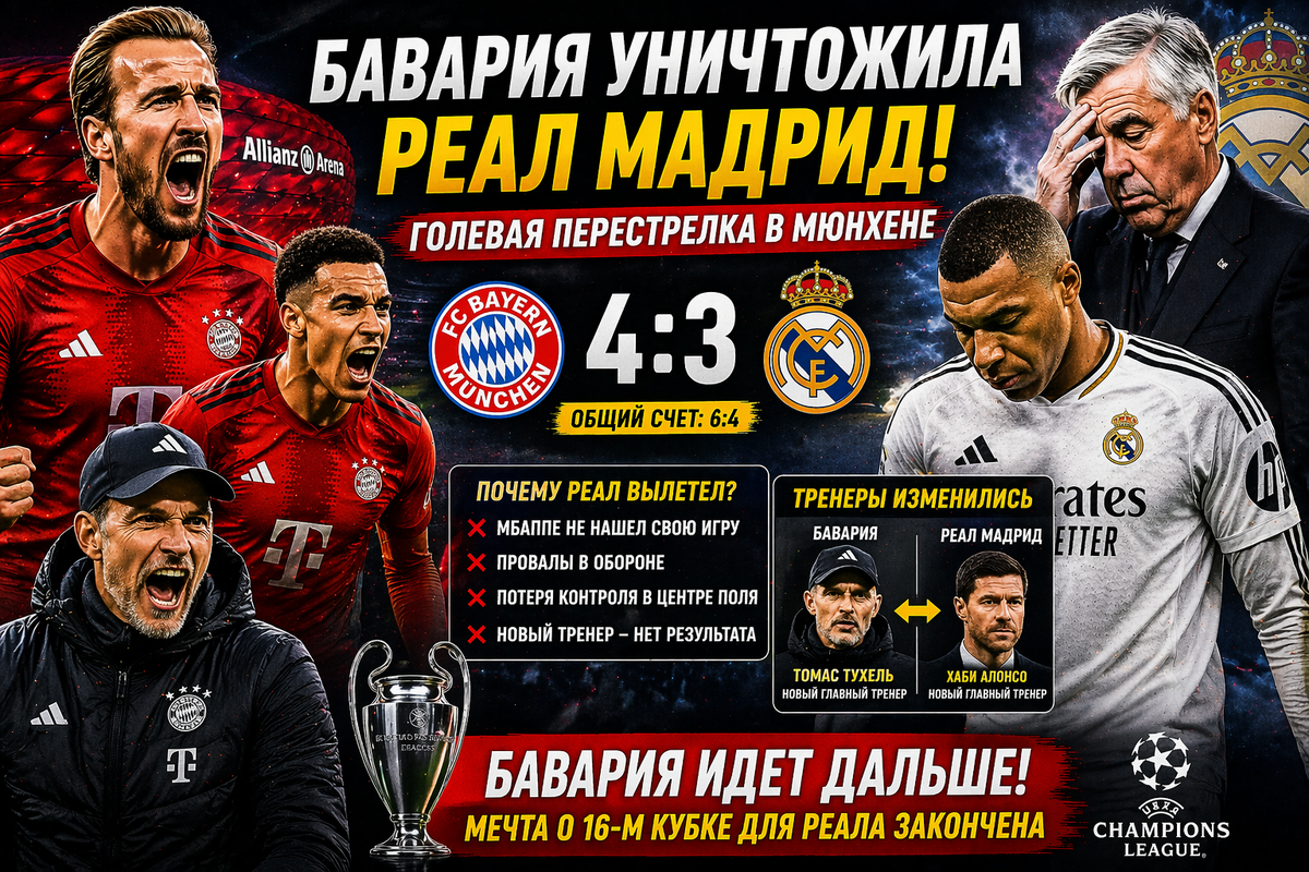 Мюнхенская «Бавария» сделала то, во что многие не верили. В ответном матче на «Альянц Арене» подопечные Томаса Тухеля переехали мадридский «Реал», оставив подопечных Анчелотти за бортом главного турнира Европы. Мадрид едет домой, а Мюнхен празднует триумф!