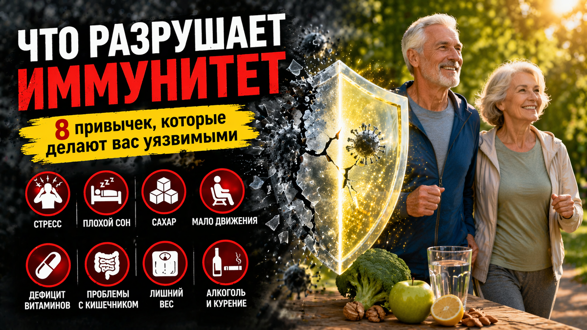 Иммунитет - это не «что-то абстрактное». Это система, которая ежедневно защищает организм от вирусов, бактерий и воспалений. И проблема в том, что чаще всего мы не «укрепляем» иммунитет, а медленно его разрушаем - своими же привычками. Разберем без мифов и воды, что реально ослабляет защиту организма. Самый недооцененный фактор. Когда стресс становится постоянным, повышается уровень кортизола. А это: Факт: люди с хроническим стрессом чаще болеют и дольше восстанавливаются. Иммунная система активно работает во сне. Если спать меньше 6-7 часов: Даже одна бессонная ночь снижает активность иммунитета на следующий день. Сахар - это не просто «калории». Он: Факт: после большого количества сахара иммунитет может «проседать» на несколько часов. Иммунитет напрямую связан с движением. Когда человек мало двигается: Регулярная ходьба уже улучшает работу иммунной системы. Иммунитет требует «строительных материалов». Особенно важны: При их дефиците: До 70% иммунной системы связано с кишечником. Если