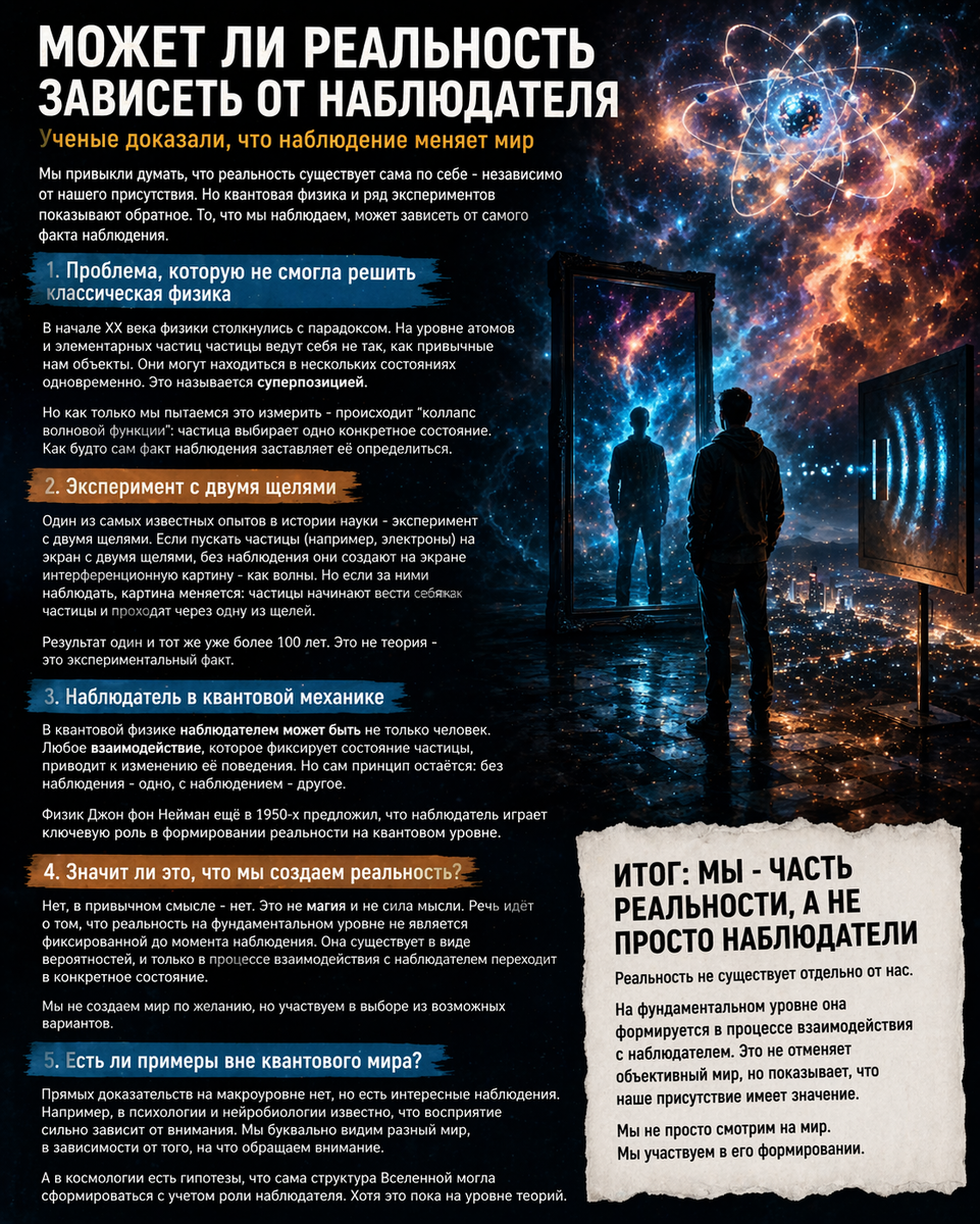 Есть идея, которая звучит как чистая философия, но на самом деле выросла из физики - реальность может зависеть от наблюдателя. Не в смысле "каждый видит по-своему". А гораздо глубже. Настолько, что сам факт наблюдения может менять то, что происходит. Разберемся, где здесь граница между наукой и интерпретацией. Начнем с простого. Человек не воспринимает мир напрямую. Мы получаем сигналы от органов чувств, а мозг собирает из них картину. Цвета - это не свойство объектов. Это интерпретация длины волны света. Звук - это не "шум", а колебания воздуха, которые мозг превращает в ощущение. То есть даже на базовом уровне мы живем не в "реальности", а в ее модели. И наблюдатель уже влияет на восприятие. Но самое интересное начинается в квантовой механике. На уровне частиц мир ведет себя иначе. Частица может находиться в нескольких состояниях одновременно. Это называется суперпозиция. Но как только мы пытаемся измерить ее состояние - она "выбирает" одно. Этот эффект известен как коллапс волновой