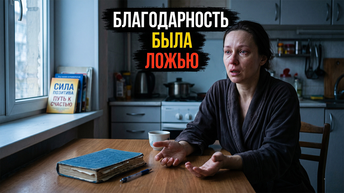 Три года подряд Ира открывала тетрадь каждое утро и писала пять пунктов благодарности. За крышу над головой. За здоровье детей. За новый день. Почерк ровный, строчки аккуратные. А внутри - тишина. Та самая тишина, от которой хочется закричать, но вместо крика выходит ещё одна строчка в тетради. Она делала всё правильно. Аффирмации утром, медитация вечером, дневник благодарности перед сном. Три года без перерыва. И три года жизнь не двигалась никуда - как заевшая пластинка, которая шипит на одном месте. Есть особый вид тишины, который рождается, когда человек говорит правильные слова, но не чувствует ни одного из них. Это похоже на заученную молитву без голоса - губы шевелятся, звук есть, а внутри ничего не вибрирует. Пустая частота. Пространство принимает не слова. Оно принимает состояние. И когда состояние фальшивое, оно получает ровно то, что отправлено, - пустоту в красивой упаковке. Люди, которые годами практикуют благодарность и не видят изменений, часто думают, что делают мало. Н