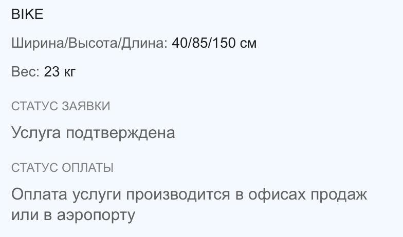 Занятная деталь перевозки велосипеда Аэрофлотом - после подтверждения заявки на перевозку в статусе оплаты значится - “оплата производится в офисах продаж или в аэропорту”. По всем текстам на сайте велосипед воспринимается, как возможная замена обычному багажу. То есть, если у вас есть место для багажа в билете, но вы не везете его, то велосипед может поехать с вами бесплатно, заняв это место. Но, если у вас есть багаж, и вы хотите везти велосипед, то доплатить за вел, как за дополнительное место багажа на сайте со скидкой (если заранее), нельзя… Вышесказанное подтвердила поддержка Аэрофлота, четко сказав, что заранее оплатить нельзя… Как же так?!