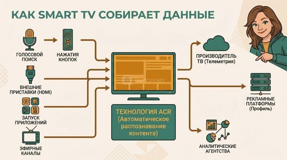 показало, что телевизоры Samsung и LG делают регулярные снимки экрана. У Samsung — примерно раз в 60 секунд, у LG — около 15 секунд. Это работает через технологию ACR (Automatic Content Recognition). Телевизор отправляет фрагменты изображения на сервер, чтобы определить, что сейчас воспроизводится. Отслеживается не только встроенный контент. Технология чекает всё, что подключено через HDMI: ноутбуки, консоли и ТВ-приставки. Функция включена по умолчанию и активируется при первичной настройке. Основная цель слежки: сбор ваших данных для рекламы. Например, Vizio заработали около $598 млн на рекламе и данных за год — больше, чем на продаже телевизоров. У LG доход от рекламного и контентного бизнеса уже приближается к $700 млн в год. Фичу можно отключить в настройках. Ищите пункты «Automatic Content Recognition» или «Smart TV Tracking». ➖➖➖➖➖➖➖➖➖ 🍽 Червоточина