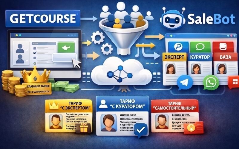 Если после покупки в GetCourse ваш чат-бот отправляет всем клиентам одинаковое дежурное сообщение - вы теряете лояльность и недозарабатываете. Покупатель Премиум-тарифа за 100 000 рублей и клиент, купивший базовый курс за 3 000 рублей, не должны получать один и тот же контент. А те, кто оставил заказ, но не оплатил, вообще нуждаются в отдельной цепочке дожима. Запускать разные воронки руками при десятках оплат в день - нереально. Разбираем, как связать GetCourse и SaleBot так, чтобы мессенджер-маркетинг работал на автопилоте, с идеальной сегментацией и передачей всех данных. Целевая аудитория: владельцы онлайн-школ, маркетологи и технические специалисты. Главная проблема: изолированность систем. Название тарифа, сумма и статус платежа остаются внутри GetCourse. Чат-бот (SaleBot) просто не знает, что клиент купил, сколько заплатил и заплатил ли вообще. В итоге прогрев идет вслепую, а брошенные корзины не дожимаются. Чтобы системы «заговорили» друг с другом, используется сервис-интеграто