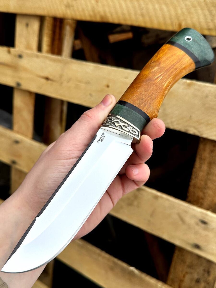 Сталь всех дольше держит заточку и самый агрессивный рез. Спуски идут от середины клинка, что делает нож более прочным при боковых нагрузках. Рукоять на ноже выполнена из мельхиора и стабилизированной карельской березы зеленой и желтой. Ножи заточены в бритву. Твердость каждого клинка (HRC): 70 Цена за нож: 38.250 рублей, со скидкой: 28.687 рублей. В комплекте идут ножны из натуральной кожи. Можем сделать формованные ножны +8000 рублей. Для заказа писать на @Nazarklinokbot или по тел +79101343831 WhatsApp/Viber
