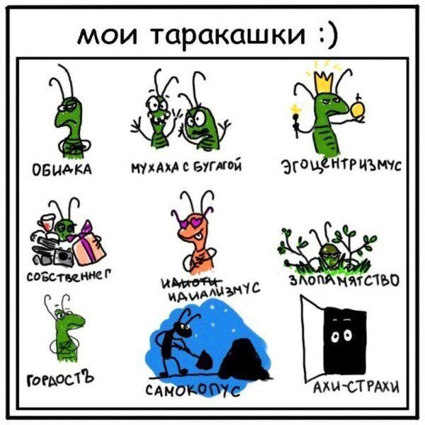 И все это делают по-разному: НАРЦИСС Постоянно отслеживает, не прыгают ли чужие тараканы выше и не выглядят ли красивее. С психотерапевтом учится безоценочно любить своих тараканов, но тайно продолжает сравнивать своих с тараканами терапевта. ШИЗОИД Презрительно относится к людям с малым количеством тараканов, считая их пустыми и примитивными. Считает собственных тараканов наиболее талантливыми, нестандартными и высокоинтеллектуальными. В терапии отстаивает право собственных тараканов быть необычными. Глубоко в душе относится к ним с трепетом и любовью, понимая, что только с собственными тараканами может установить самые близкие, теплые и понимающие отношения. ИСТЕРИЧКА С удовольствием демонстрирует своих тараканов, выдавая их за милые женские штучки. «На выход» повязывает тараканам розовые бантики. Верит, что ее тараканы настолько умилительны, что способны очаровывать и соблазнить любое стадо в мужской голове. ПАРАНОИК Посвящает жизнь тому, чтобы не допустить чужих таракано