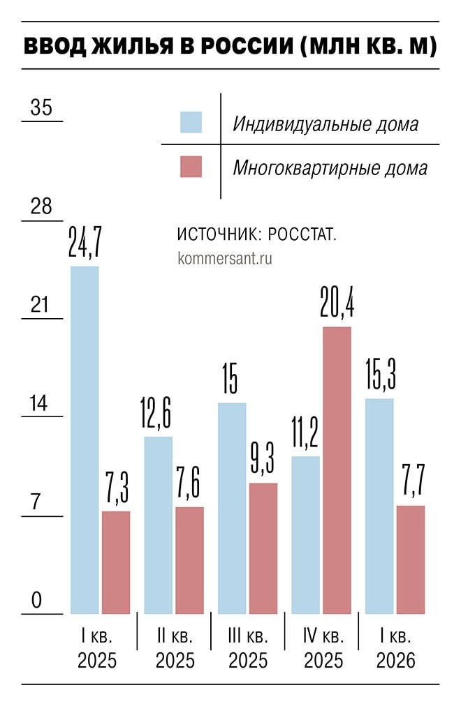 Ввод жилья в России в I квартале 2026 года снизился на 28,2% — до ~23 млн м². Основной вклад в падение дал сегмент ИЖС, который формирует почти 70% всего ввода. ⬇️ Население ввело 15,3 млн м² — это минус 38,1% год к году. Во многом сработал эффект высокой базы: в начале 2025-го ИЖС рос ускоренными темпами, и сейчас рынок просто откатился. 🔵По мнению экспертов, рынок сильно зависит от неравномерности стройки, а стимулов возвращаться к объемам 2023–2024 годов у девелоперов пока нет.