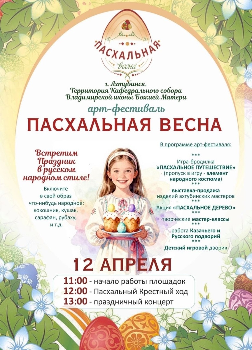 🤗 👉Центр народной культуры приглашает всех желающих на традиционный арт-фестиваль «Пасхальная весна». Мероприятие состоится завтра, 12 апреля, на территории Кафедрального собора Владимирской иконы Божией Матери. 🌞 11:00 - начнут работу арт-площадки фестиваля; 🌞 12:00 - Пасхальный Крестный ход; 🌞 13:00 - большой праздничный концерт. ☝Организаторы фестиваля предлагают встретить праздник в русском народном стиле. Для этого можно добавить в свой праздничный образ что-нибудь народное (кокошник, кушак,сарафан, рубаху, и т.д.)