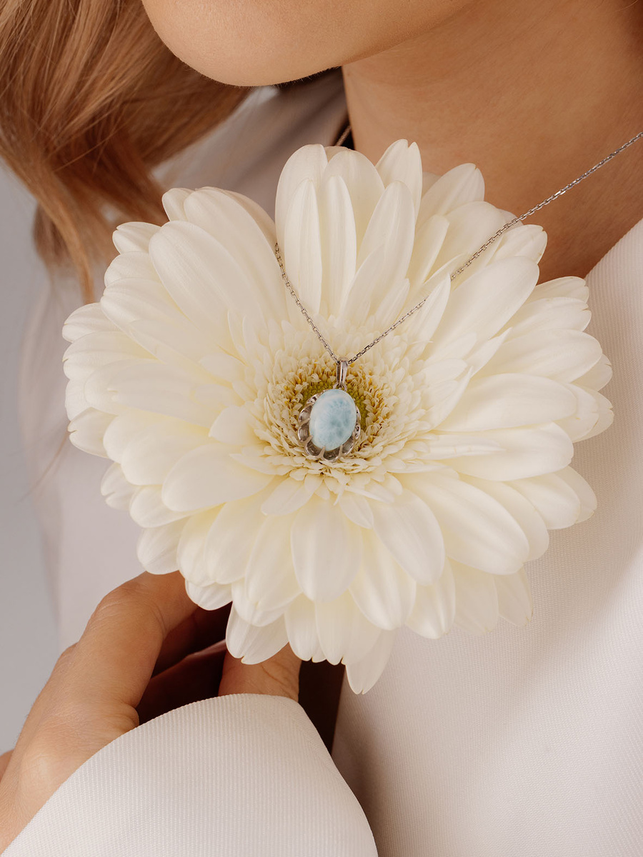 Серебро — идеальная оправа для ларимара. Холодный металлический блеск подчёркивает свежесть голубых оттенков и усиливает «водную» эстетику камня.