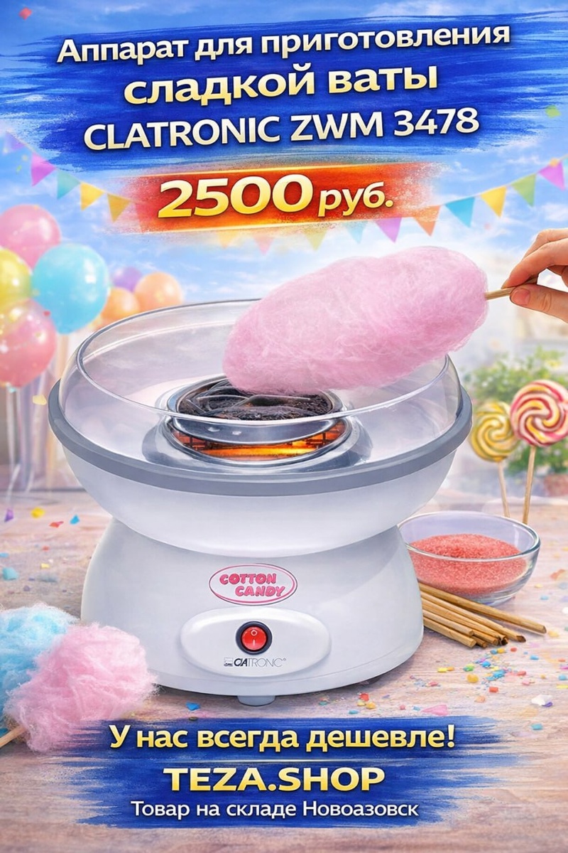 ! 🎉Устрой настоящий праздник дома — как в парке развлечений! Почему стоит купить: ✨ Готовьте любимое лакомство для всей семьи в любое время ✨ Нужен только сахар и хорошее настроение ✨ Полный контроль качества — без лишних добавок и вредных веществ ✨ Всего 1 чайная ложка сахара на порцию ✨ Быстро и просто — готово за 7–10 минут 🔥 У нас всегда дешевле! 🗺 TEZA.SHOP 🗃 В наличии на складе (Новоазовск) 📞 +7 (949) 301-08-41
