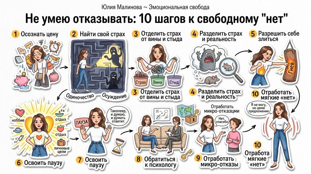 Я как психолог, специализирующийся на работе с чувством вины, тревогой и нарушениями личных границ, постоянно слышу от клиентов одну и ту же боль: "Я говорю „да“, когда хочу сказать „нет“, а потом ненавижу себя за это". В этой статье я расскажу, как шаг за шагом пройти путь от токсичной вежливости и внутреннего истощения к спокойному, уверенному отказу без страха испортить отношения. Я соглашаюсь и ненавижу себя за это. Потом злюсь на них. Потом снова соглашаюсь, потому что боюсь обидеть, потерять, остаться одной. Я давно не помню, чего хочу я сама. Кажется, моя жизнь принадлежит всем, кроме меня. Шаг 1. Осознать цену.