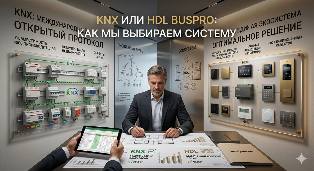 Этот вопрос возникает на каждом проекте. И правильный ответ никогда не бывает универсальным — он зависит от объекта, задач и горизонта эксплуатации. Мы работаем с обеими системами с 2008 года. Рассказываем, как принимаем решение. KNX: открытый стандарт с историей KNX — это не бренд, а международный протокол автоматизации зданий, принятый в более чем 190 странах. Ему следуют ABB, Schneider Electric, Siemens, Jung, Gira и ещё свыше 500 производителей. Оборудование любого из них совместимо между собой — это принципиально важно для крупных и долгосрочных объектов. Система не зависит от одного вендора, легко масштабируется и интегрируется с любым смежным оборудованием. Проект, сделанный на KNX сегодня, можно расширить через 10 лет оборудованием, которого ещё не существует. HDL Buspro: полноценная экосистема с оптимальным соотношением возможностей и стоимости HDL — ведущий производитель оборудования для автоматизации зданий с более чем 40-летней историей. Проприетарный протокол Buspro обеспе