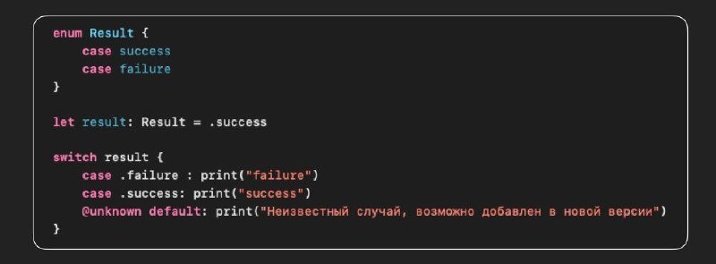 @unknown default — это специальный атрибут для блока default в операторе switch при работе с перечислениями (enum). Он используется для обработки возможных будущих случаев, которые могут быть добавлены в enum позже. Когда вы используете switch с enum, компилятор требует, чтобы вы обработали все возможные случаи (cases). @unknown default позволяет: - Обрабатывать все текущие случаи явно - Предоставлять "запасной" вариант для возможных будущих случаев, которые могут быть добавлены в enum в следующих версиях Отличие от обычного default: - Обычный default обрабатывает ВСЕ неучтённые случаи БЕЗ предупреждений - @unknown default ВЫЗЫВАЕТ ПРЕДУПРЕЖДЕНИЕ компилятора, если есть необработанные СУЩЕСТВУЮЩИЕ случаи (но обрабатывает возможные будущие случаи) Пользуйтесь