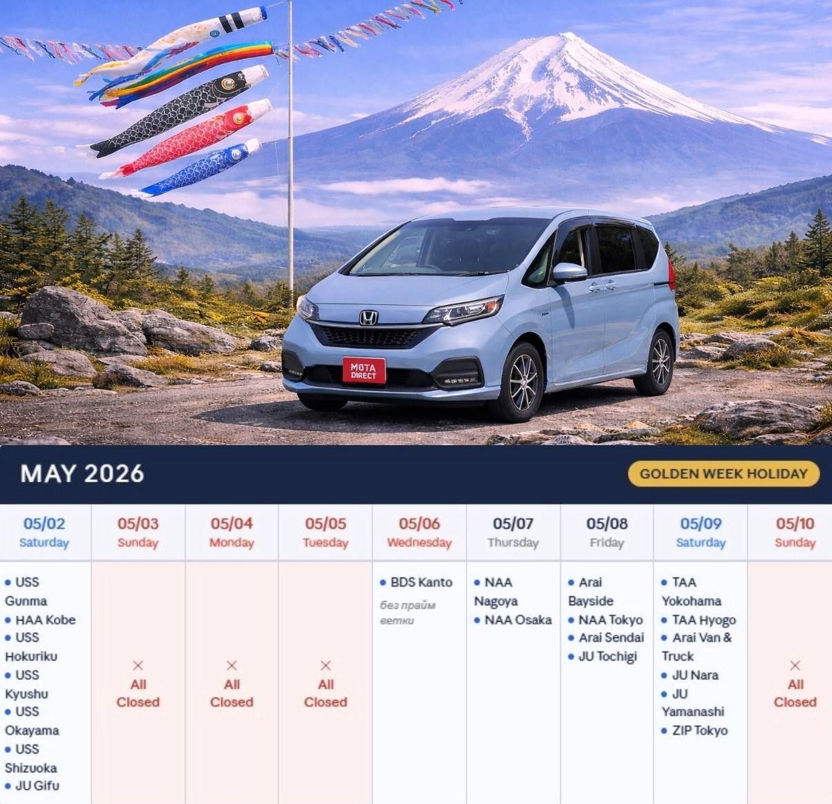 Π£Π²Π°ΠΆΠ°Π΅ΠΌΡΠ΅ ΠΊΠ»ΠΈΠ΅Π½ΡΡ, Π ΠΌΠ°Π΅ Π―ΠΏΠΎΠ½ΠΈΡ ΡΡΠ°Π΄ΠΈΡΠΈΠΎΠ½Π½ΠΎ ΠΎΡΠΌΠ΅ΡΠ°Π΅Ρ Β«ΠΠΎΠ»ΠΎΡΡΡ Π½Π΅Π΄Π΅Π»ΡΒ» ΠΏΡΠ°Π·Π΄Π½ΠΈΠΊΠΎΠ². Π‘ 3 ΠΏΠΎ 5 ΠΌΠ°Ρ Π°ΡΠΊΡΠΈΠΎΠ½Ρ ΡΠ°Π±ΠΎΡΠ°ΡΡ Π½Π΅ Π±ΡΠ΄ΡΡ. 6, 7, 8, 9 ΠΌΠ°Ρ ΡΠ°Π±ΠΎΡΠ°ΡΡ ΡΠΎΠ»ΡΠΊΠΎ Π½Π΅ΠΊΠΎΡΠΎΡΡΠ΅ ΠΈΠ· Π½ΠΈΡ