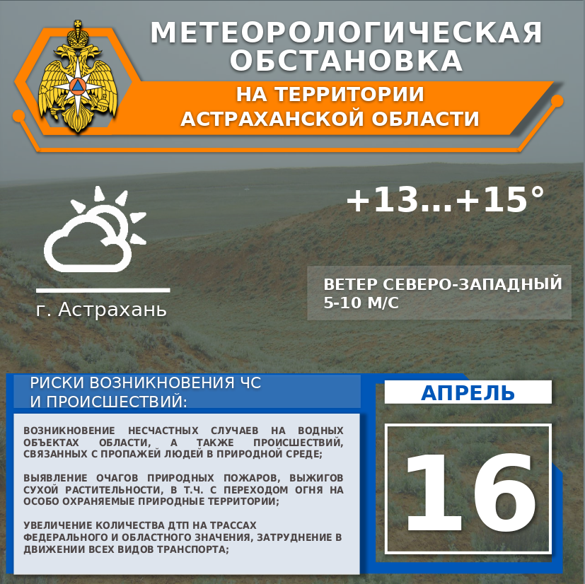 На территории области переменная облачность. Кратковременные дожди. Ветер северо-западный, западный 6-11 м/с. Температура воздуха +13...+18°. По г. Астрахань переменная облачность. Небольшой дождь. Ветер северо-западный 5-10 м/с. Температура воздуха +13...+15°.