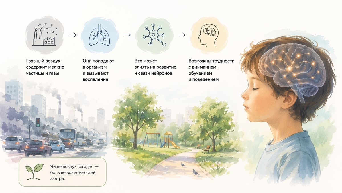 Поэтому загрязненный воздух опасен не только потому, что ребенку «вредно дышать». Такая формулировка слишком мягкая и почти бесполезная. Опасность в другом. Мелкие частицы и сопутствующие загрязнители могут запускать хроническое воспаление, усиливать окислительный стресс и влиять на сосуды, иммунные реакции и обменные процессы. Для взрослого мозга такой фон уже плох. Для развивающегося мозга такой фон еще и вмешательство в период, когда сама архитектура системы не устоялась.